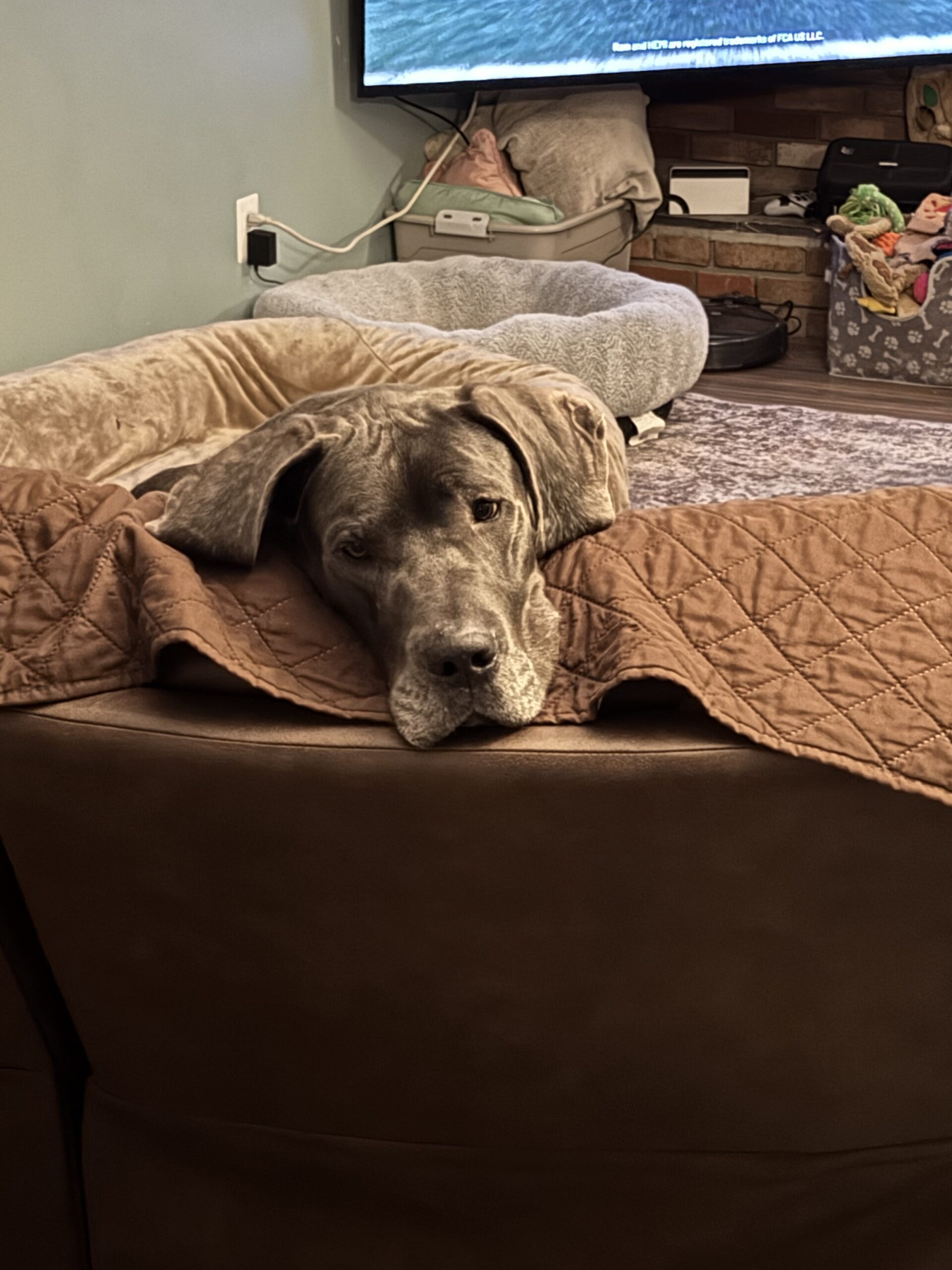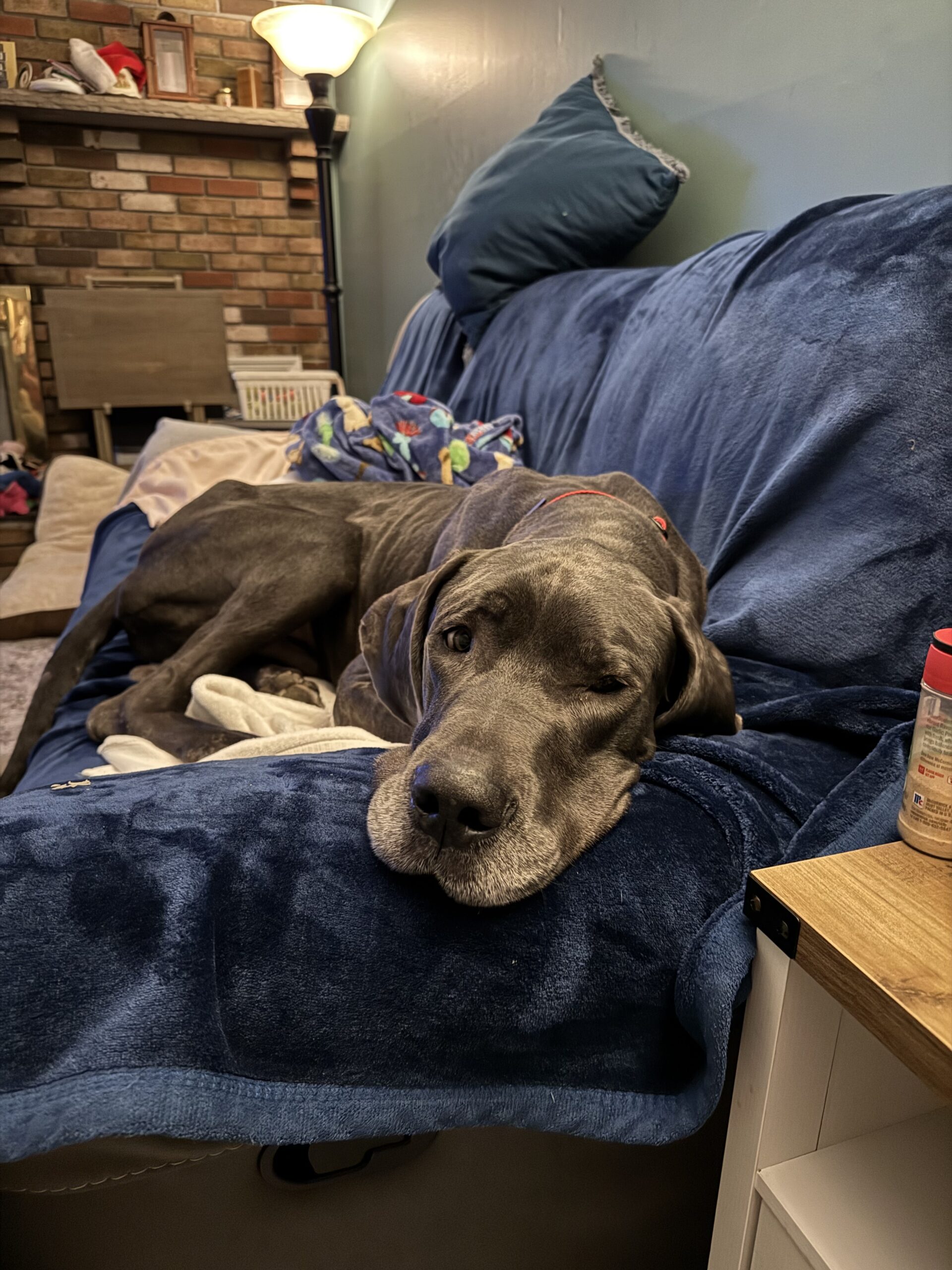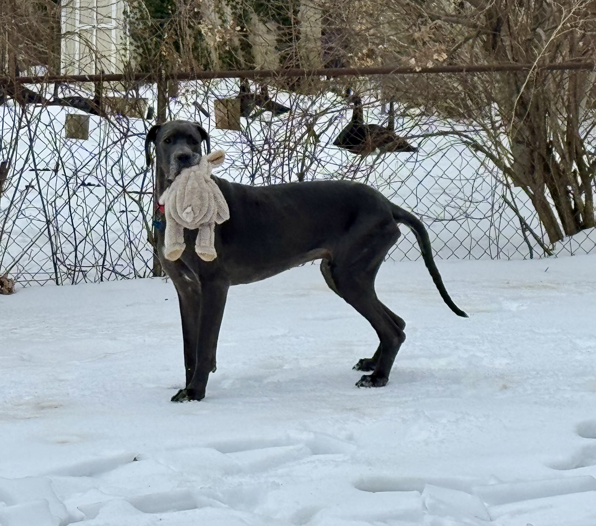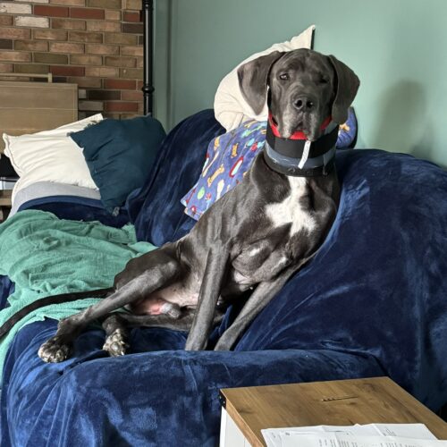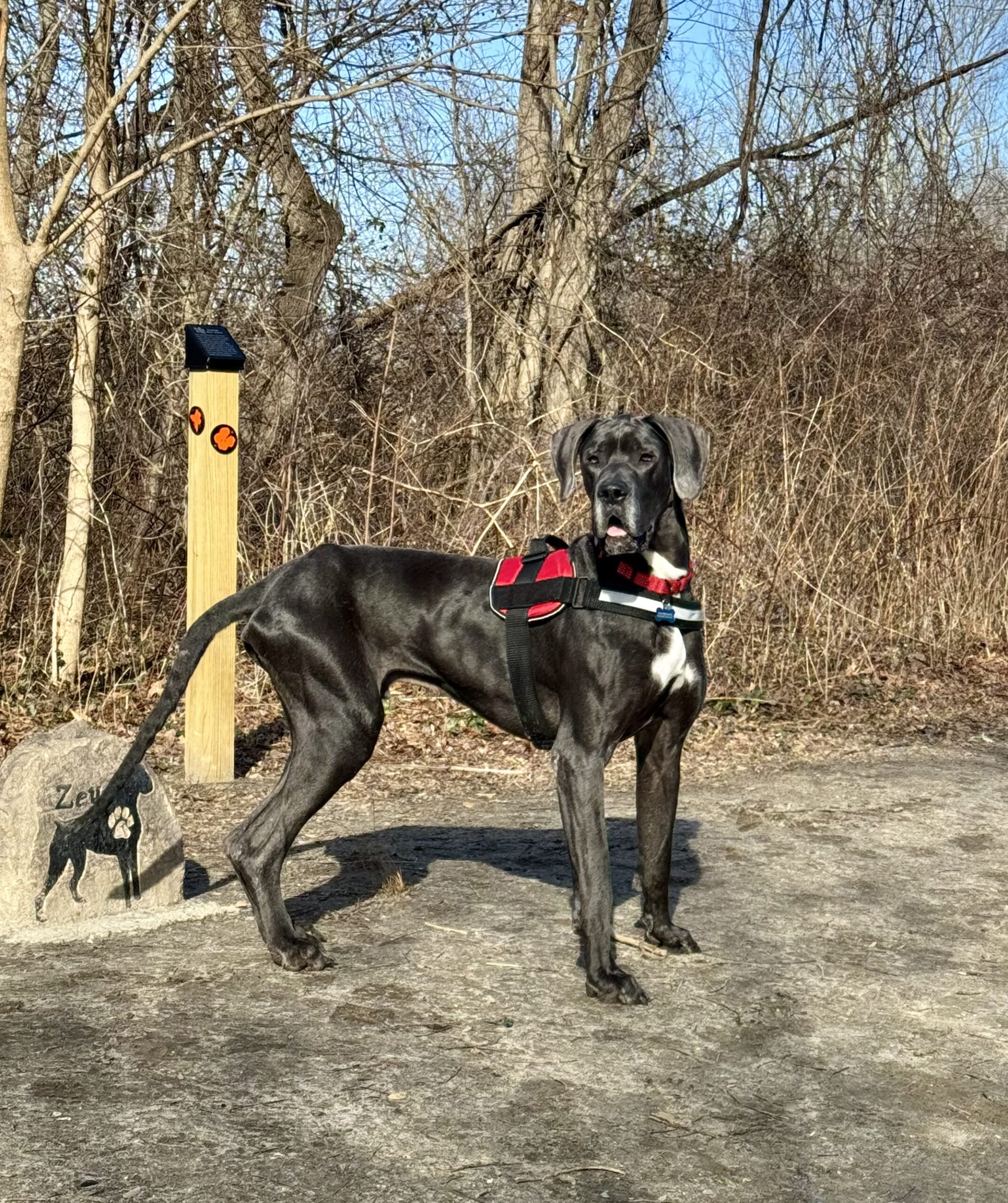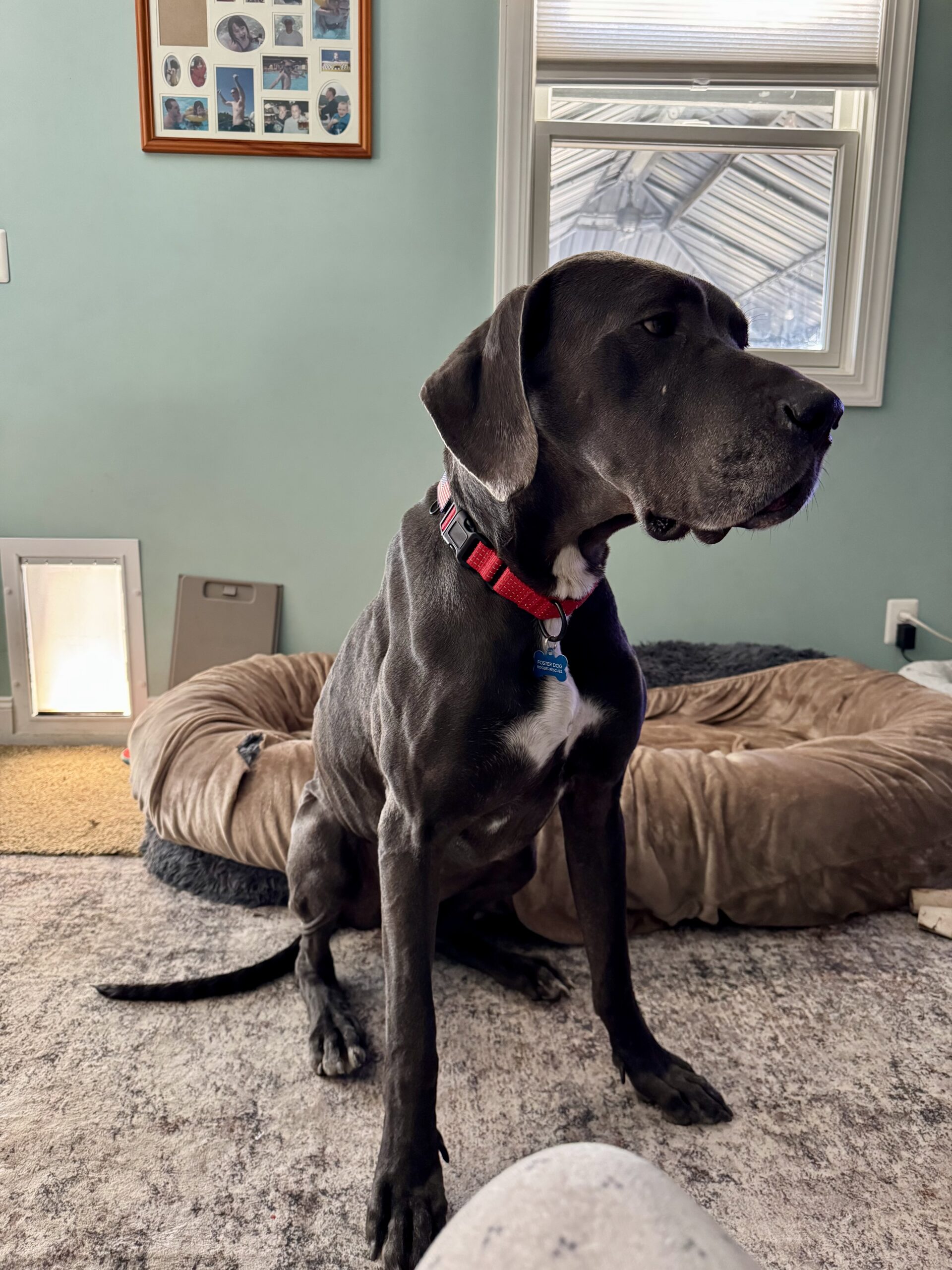 Bodie is a typical Great Dane who hasn't had an easy life so far. But all of that changed in Nov. Bodie was found wandering the streets of West Virginia looking for food and a safe place to curl up. He was picked up and taken to the local shelter where he was scheduled to be euthanized because they were (and often face) being completely out of space. He hitched a ride to NJ where he landed in foster care with a family who already have 2 dogs: a 36lb spaniel mix and a 14lb Havanese. Bodie was delighted to be inside and have a full belly. The foster family has children that live in the south, so after a week's respite in NJ, Bodie was packed up, along with the 2 family dogs and hit the road for a 2 week road trip to visit the kids and their dogs. Bodie is a Great traveler. He smoothly shifted from one stop to the next as long as he had his humans in tow. He rides great in the car (although likes to rest his head on your shoulder while riding). We visited a house with a fenced back yard as well as a townhouse where he needed to be leash walked and Bodie handled it all like a champ. He doesn't love his crate as he would much rather be sitting on the couch next to you, but on the few times we weren't able to bring him along he waited in his crate for our return. Bodie has visited 2 separate off leash dog parks where he felt everyone, both human & canine were simply friends he hadn't met yet.