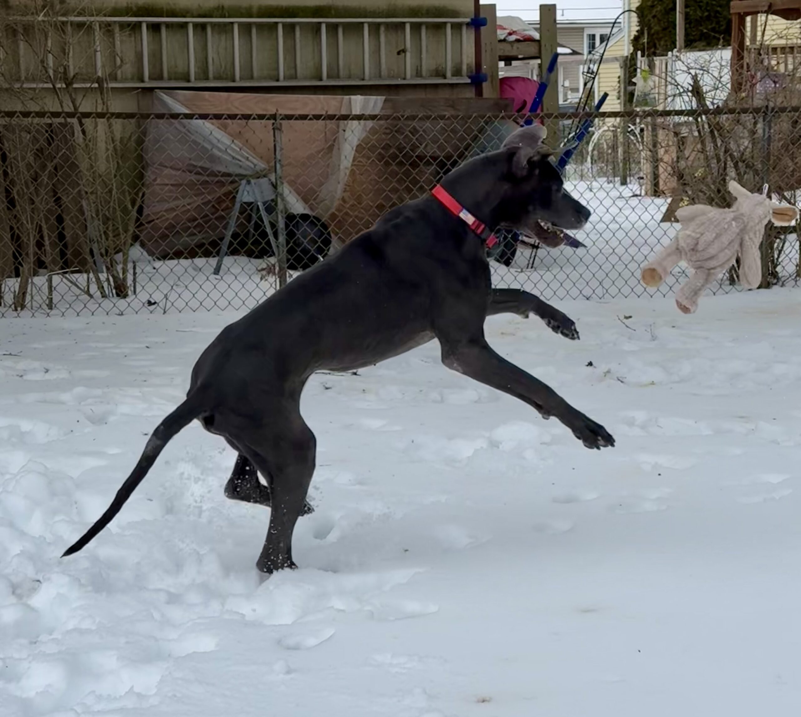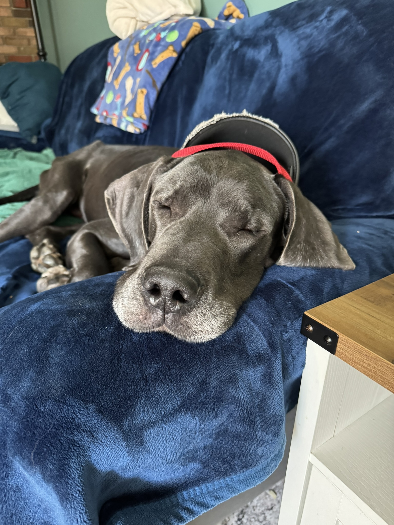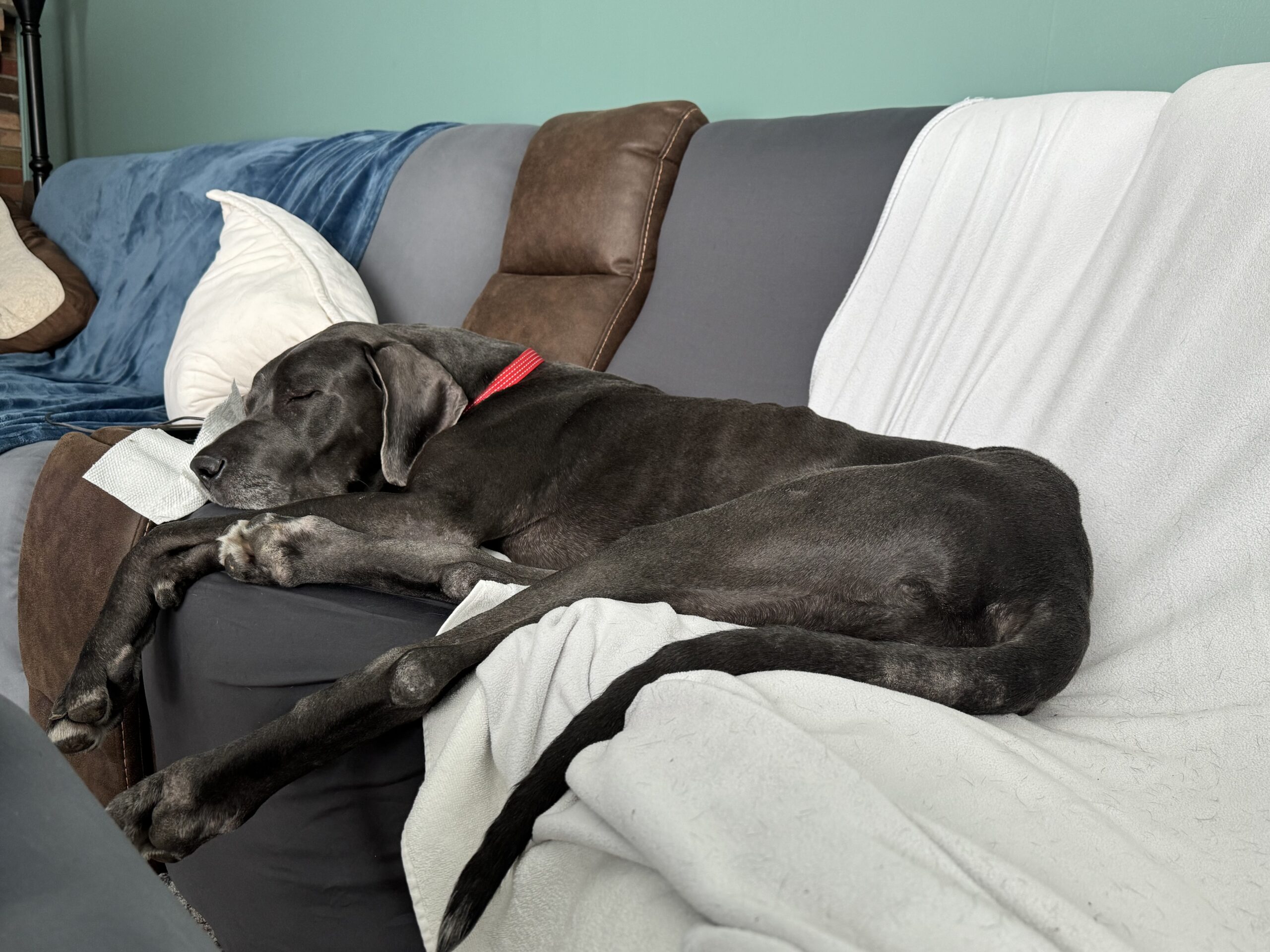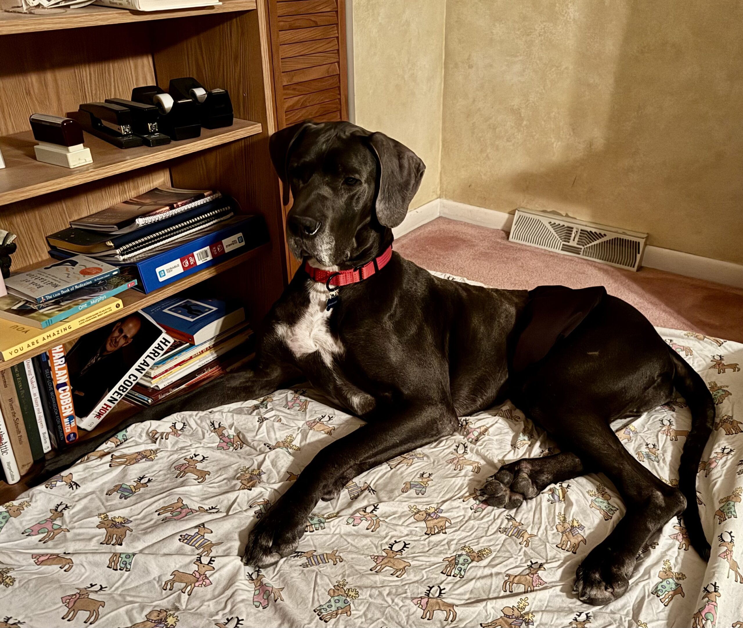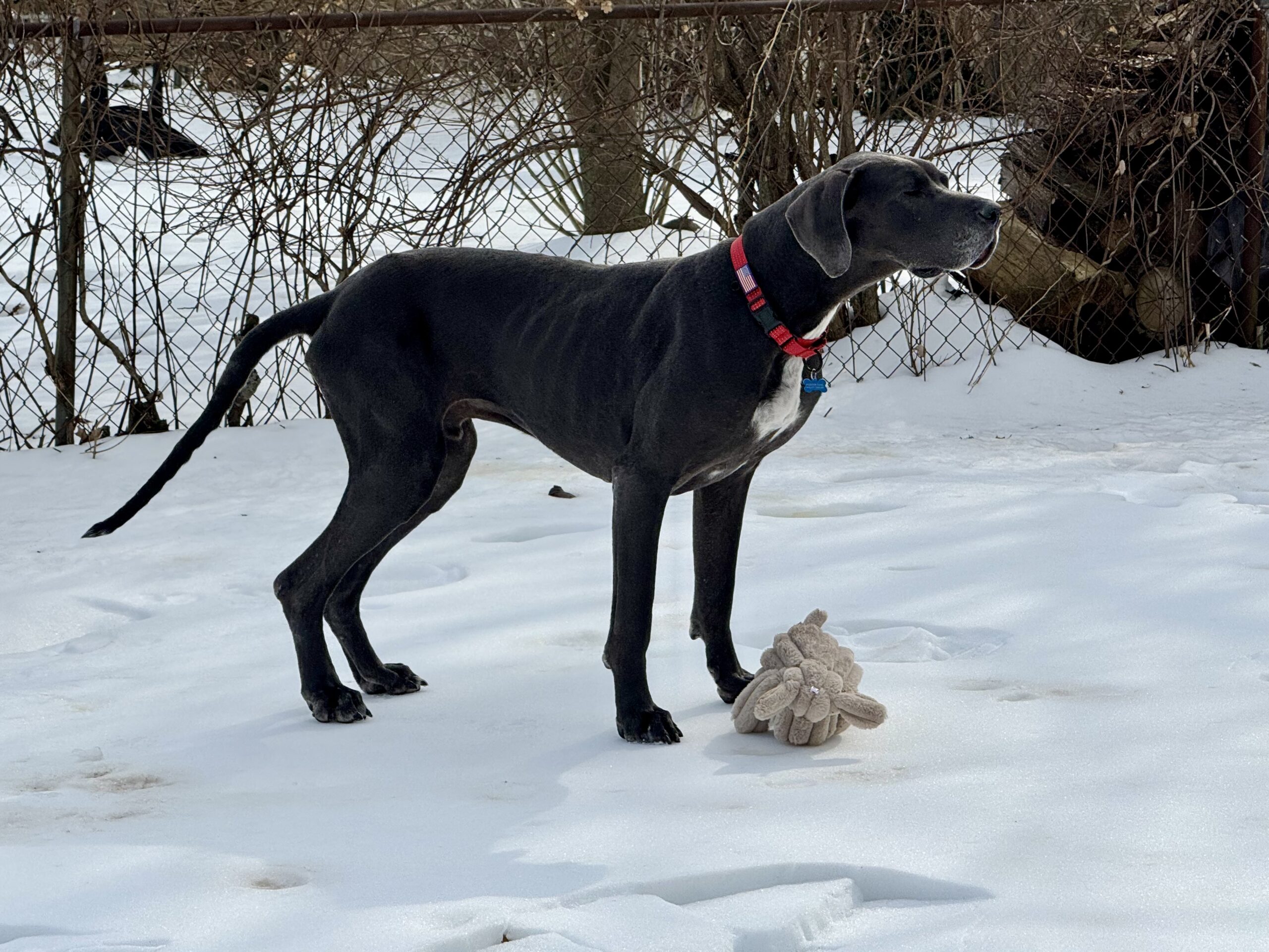 Bodie is a typical Great Dane who hasn't had an easy life so far. But all of that changed in Nov. Bodie was found wandering the streets of West Virginia looking for food and a safe place to curl up. He was picked up and taken to the local shelter where he was scheduled to be euthanized because they were (and often face) being completely out of space. He hitched a ride to NJ where he landed in foster care with a family who already have 2 dogs: a 36lb spaniel mix and a 14lb Havanese. Bodie was delighted to be inside and have a full belly. The foster family has children that live in the south, so after a week's respite in NJ, Bodie was packed up, along with the 2 family dogs and hit the road for a 2 week road trip to visit the kids and their dogs. Bodie is a Great traveler. He smoothly shifted from one stop to the next as long as he had his humans in tow. He rides great in the car (although likes to rest his head on your shoulder while riding). We visited a house with a fenced back yard as well as a townhouse where he needed to be leash walked and Bodie handled it all like a champ. He doesn't love his crate as he would much rather be sitting on the couch next to you, but on the few times we weren't able to bring him along he waited in his crate for our return. Bodie has visited 2 separate off leash dog parks where he felt everyone, both human & canine were simply friends he hadn't met yet.